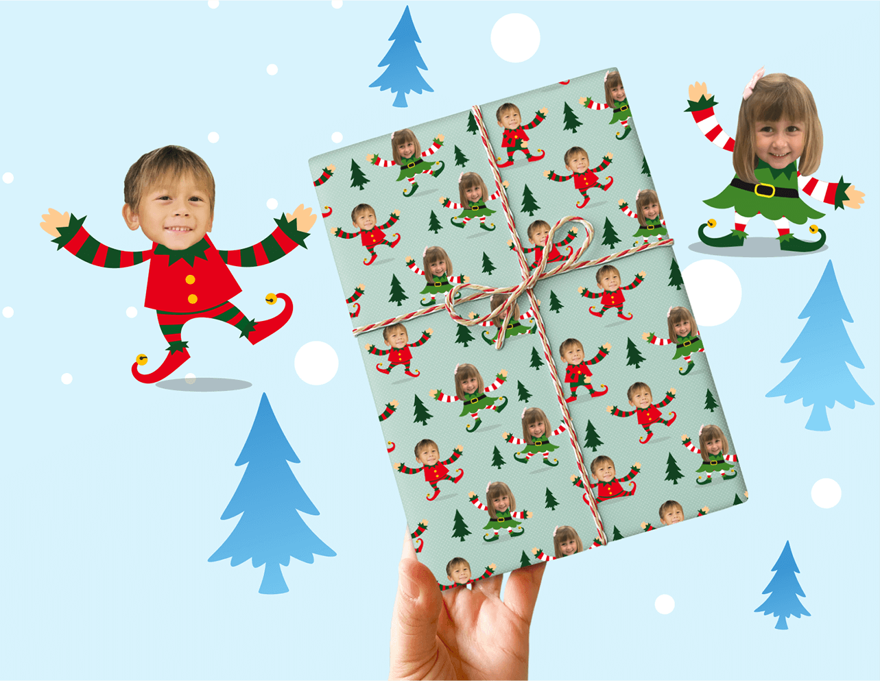 It starts with wrapping paper, but why stop there? We print your face (or theirs) on tags, socks, and more.